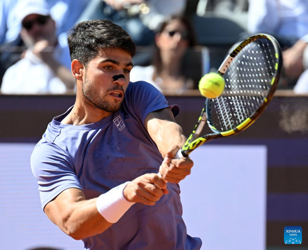 ROMA, 17 mayo, 2025 (Xinhua) -- Imagen del 16 de mayo de 2025 de Carlos Alcaraz devolviendo la pelota durante el partido de semifinal de individuales masculinos entre Carlos Alcaraz, de España, y Lorenzo Musetti, de Italia, en el Abierto de Italia de la ATP, en Roma, Italia. (Xinhua/Alberto Lingria)