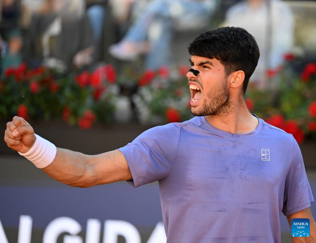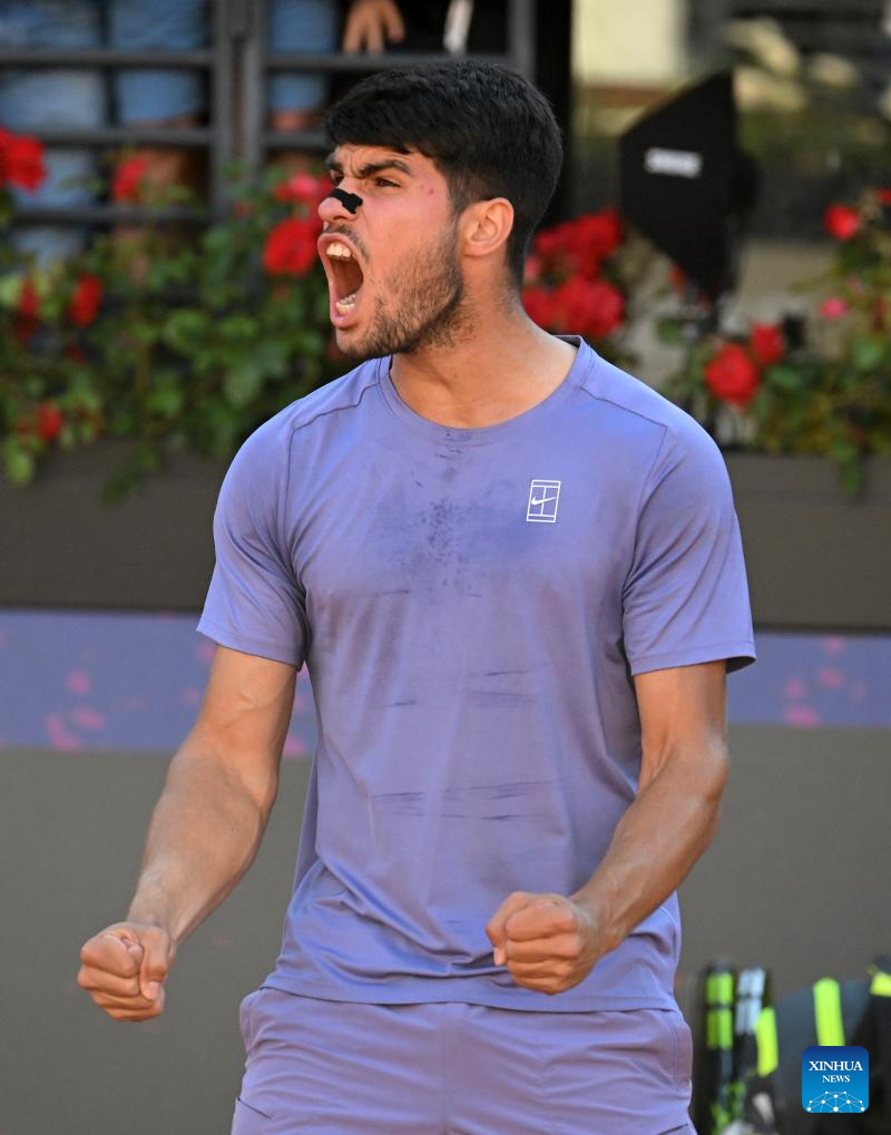 ROMA, 17 mayo, 2025 (Xinhua) -- Imagen del 16 de mayo de 2025 de Carlos Alcaraz festejando después de ganar el partido de semifinal de individuales masculinos entre Carlos Alcaraz, de España, y Lorenzo Musetti, de Italia, en el Abierto de Italia de la ATP, en Roma, Italia. (Xinhua/Alberto Lingria)