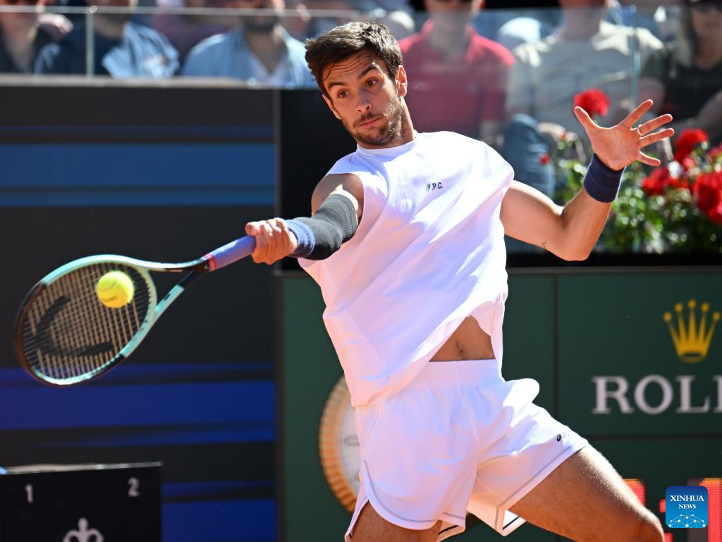 ROMA, 17 mayo, 2025 (Xinhua) -- Imagen del 16 de mayo de 2025 de Lorenzo Musetti devolviendo la pelota durante el partido de semifinal de individuales masculinos entre Carlos Alcaraz, de España, y Lorenzo Musetti, de Italia, en el Abierto de Italia de la ATP, en Roma, Italia. (Xinhua/Alberto Lingria)