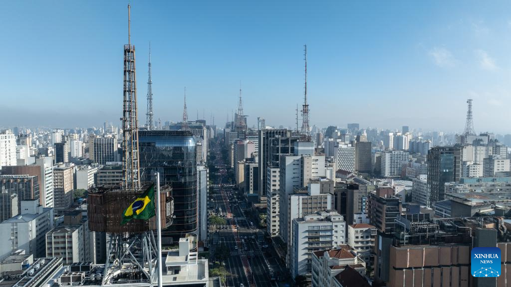 SAO PAULO, 17 mayo, 2025 (Xinhua) -- Vista aérea tomada con un dron el 15 de mayo de 2025 de edificios de gran altura a lo largo de la Avenida Paulista, en Sao Paulo, Brasil. (Xinhua/Wang Tiancong)