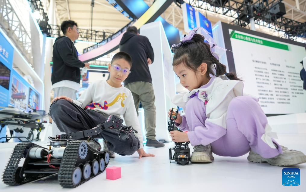 HARBIN, 19 mayo, 2025 (Xinhua) -- Niños juegan con un robot en la 34ª Feria Internacional de Economía y Comercio de Harbin, en Harbin, capital de la provincia de Heilongjiang, en el noreste de China, el 19 de mayo de 2025. La feria presentó tecnologías de vanguardia como conducción autónoma, satélites comerciales y robots humanoides de más de 100 empresas tecnológicas. (Xinhua/Wang Jianwei)