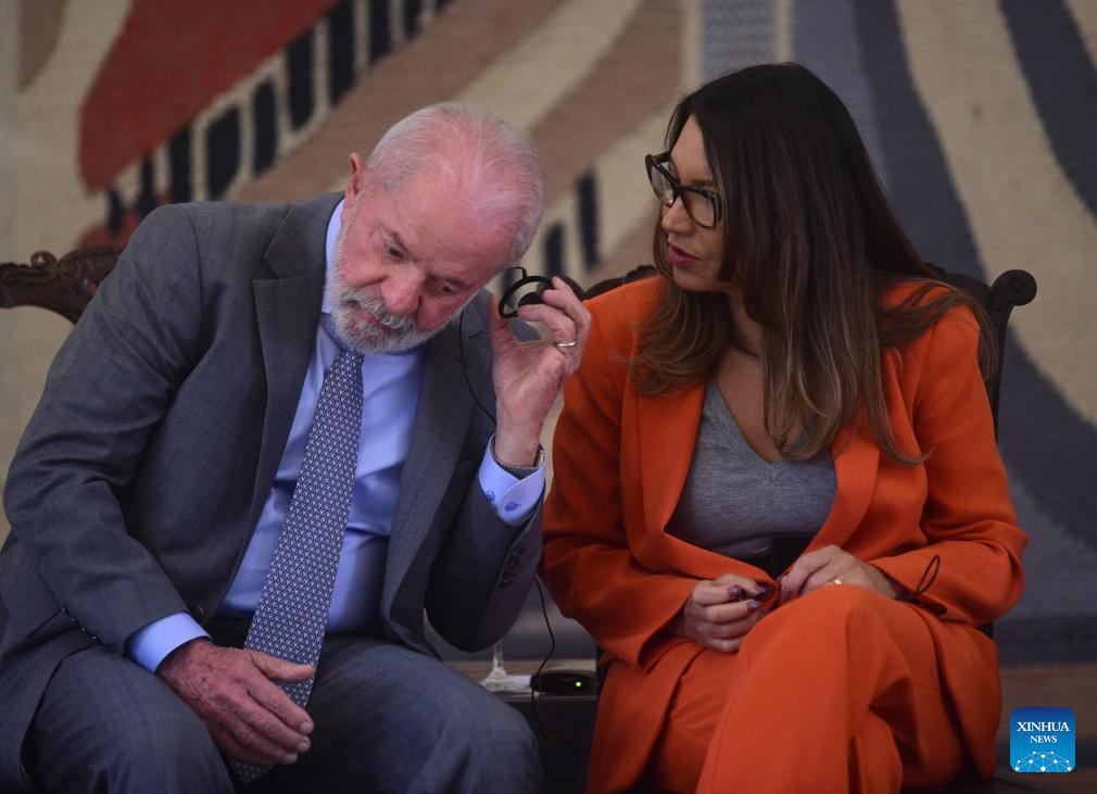 Imagen del 19 de mayo de 2025 del presidente brasileño, Luiz Inácio Lula da Silva (i), escuchando a la primera dama brasileña, Rosangela da Silva (d), durante la inauguración del II Diálogo Brasil-Africa sobre Seguridad Alimentaria, Combate a la Pobreza y Desarrollo Rural, realizado en el Palacio de Itamaraty, en Brasilia, Brasil. Lula da Silva criticó el lunes el elevado gasto global en armamentos y guerras, y defendió la necesidad urgente de canalizar más recursos hacia la lucha contra el hambre y el desarrollo rural sostenible, especialmente en Africa. (Xinhua/Lucio Tavora)