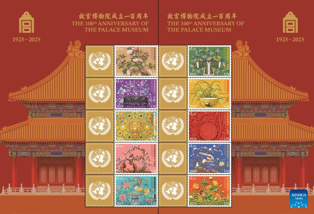 NACIONES UNIDAS, 20 mayo, 2025 (Xinhua) -- Imagen de una hoja de sellos conmemorativa de la ONU con motivo del centenario del Museo del Palacio. La Ciudad Prohibida, una vez sede de los emperadores chinos, fue homenajeada a nivel mundial el lunes cuando diplomáticos, funcionarios de la ONU y líderes culturales se reunieron en la sede de la ONU para celebrar el centenario del Museo del Palacio. (Xinhua)