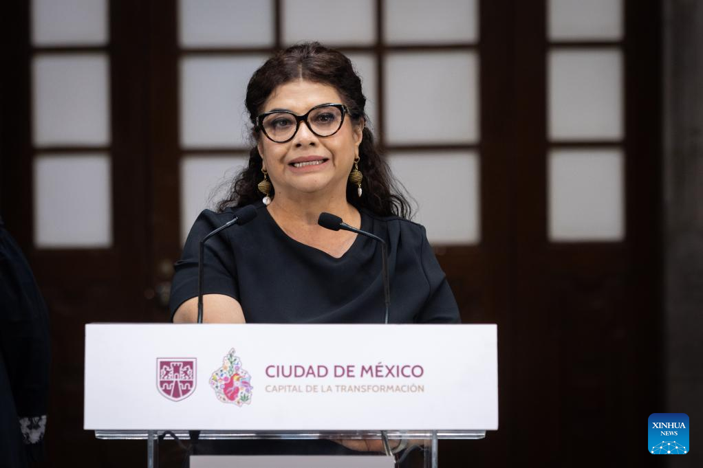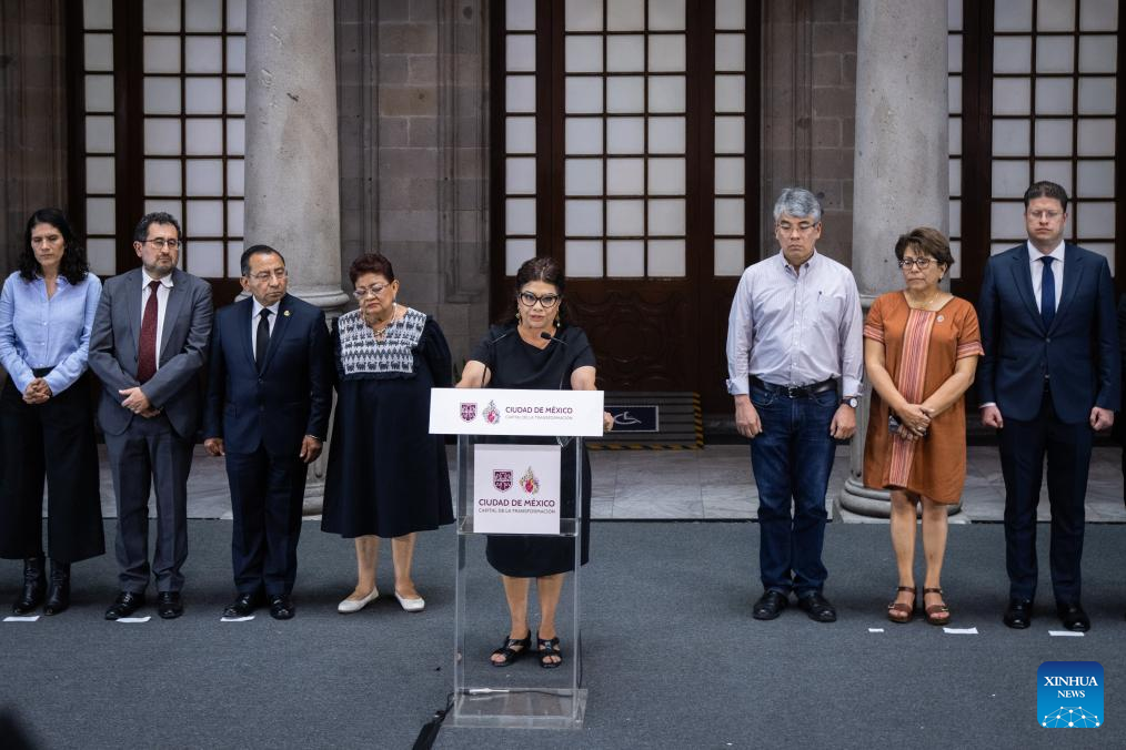 La jefa de Gobierno de la Ciudad de México, Clara Brugada (c-frente), habla durante una conferencia de prensa, en la Ciudad de México, capital de México, el 20 de mayo de 2025. En un ataque directo fueron asesinados la mañana del martes dos colaboradores cercanos de la jefa de Gobierno de la Ciudad de México, Clara Brugada: su secretaria particular, Ximena Guzmán, y su asesor José Muñoz. (Xinhua/Str)