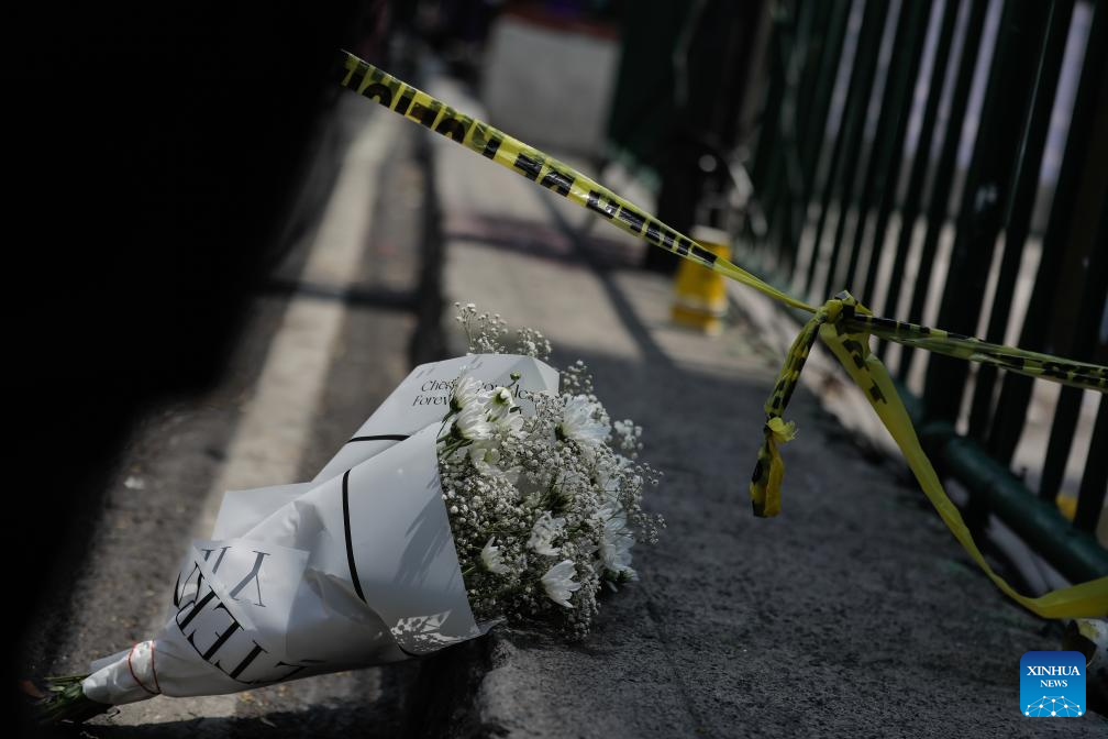 Imagen del 20 de mayo de 2025 de un ramo de flores y un cordón policial vistos en el sitio de un ataque contra Ximena Guzmán, secretaria particular de la jefa de Gobierno de la Ciudad de México, Clara Brugada, en la Ciudad de México, capital de México. En un ataque directo fueron asesinados la mañana del martes dos colaboradores cercanos de la jefa de Gobierno de la Ciudad de México, Clara Brugada: su secretaria particular, Ximena Guzmán, y su asesor, José Muñoz. (Xinhua/Str)