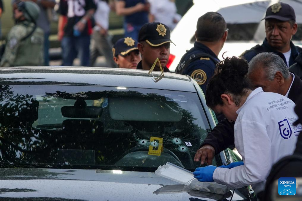 Personal de investigación forense y servicios periciales, y elementos de seguridad, trabajan luego de un ataque contra el vehículo en el que viajaba Ximena Guzmán, secretaria particular de la jefa de Gobierno de la Ciudad de México, Clara Brugada, en la Ciudad de México, capital de México, el 20 de mayo de 2025. En un ataque directo fueron asesinados la mañana del martes dos colaboradores cercanos de la jefa de Gobierno de la Ciudad de México, Clara Brugada: su secretaria particular, Ximena Guzmán, y su asesor, José Muñoz. (Xinhua/Str)