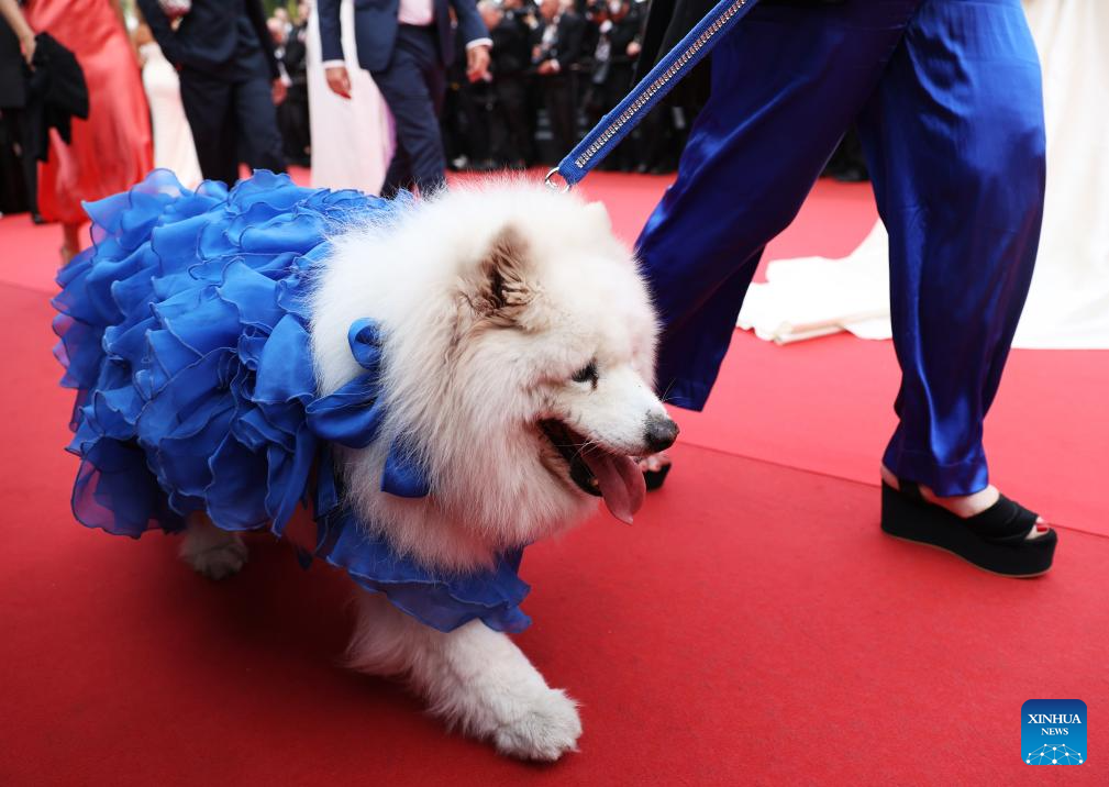 CANNES, 20 mayo, 2025 (Xinhua) -- Imagen del 19 de mayo de 2025 de un perro disfrazado llegando a la proyección de la película "Highest 2 Lowest" en la 78 edición del Festival de Cine de Cannes, en Cannes, en el sur de Francia. (Xinhua/Gao Jing)