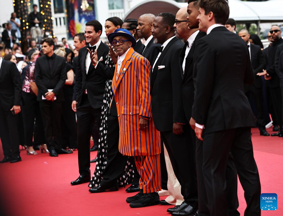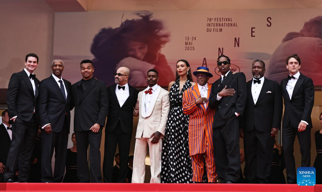 CANNES, 20 mayo, 2025 (Xinhua) -- Imagen del 19 de mayo de 2025 del director estadounidense Spike Lee (c) y el actor estadounidense, Denzel Washington (2-d), llegando a la proyección de la película "Highest 2 Lowest" en la 78 edición del Festival de Cine de Cannes, en Cannes, en el sur de Francia. (Xinhua/Gao Jing)