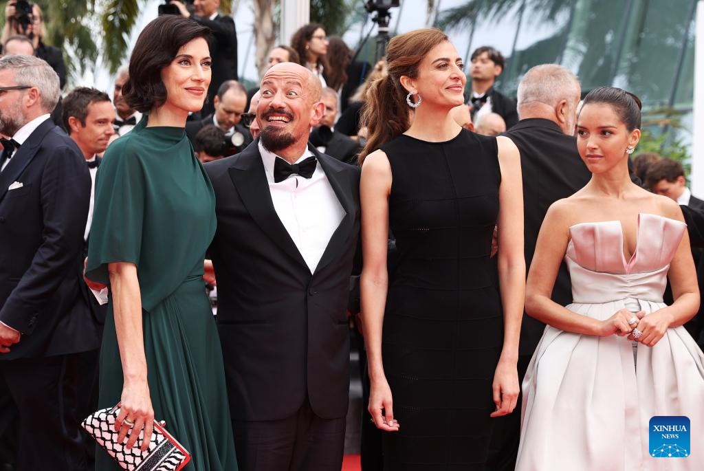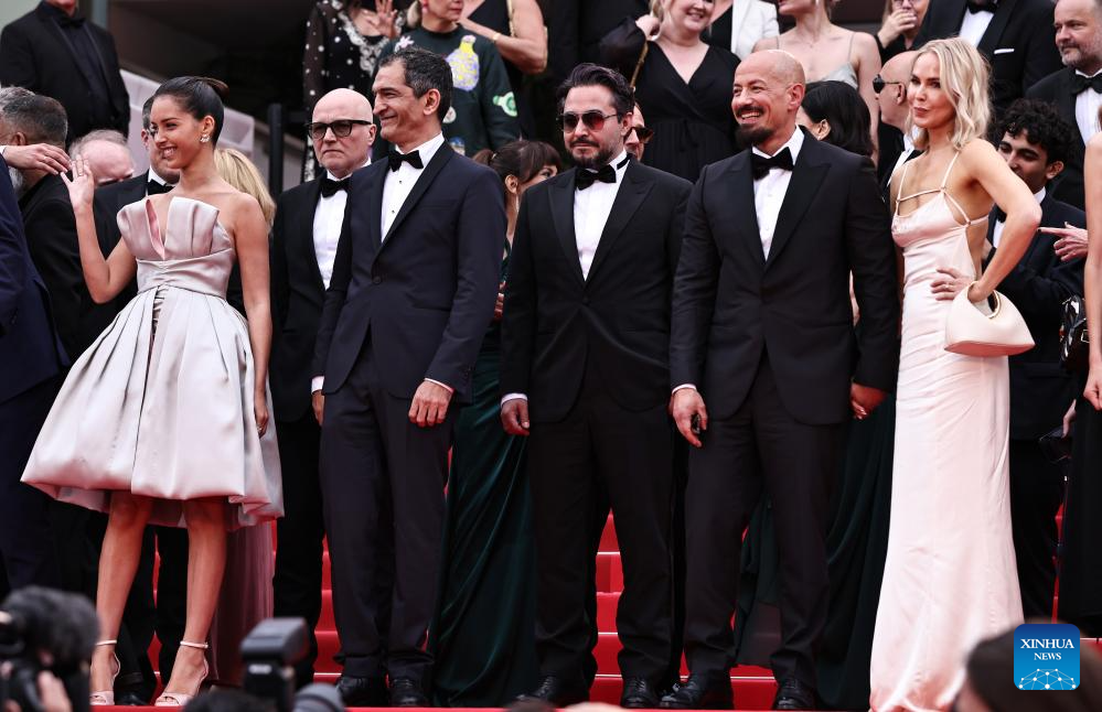 CANNES, 20 mayo, 2025 (Xinhua) -- Imagen del 19 de mayo de 2025 del director sueco, Tarik Saleh (2-i), retirándose con miembros del elenco después de la proyección de la película "Eagles of the Republic", en la 78 edición del Festival de Cine de Cannes, en Cannes, en el sur de Francia. (Xinhua/Gao Jing)