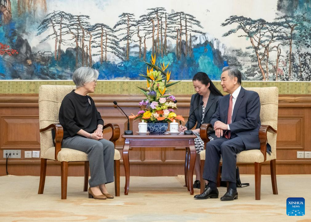 BEIJING, 21 mayo, 2025 (Xinhua) -- El ministro de Relaciones Exteriores chino, Wang Yi, también miembro del Buró Político del Comité Central del Partido Comunista de China, se reúne con Kyung-wha Kang, presidenta de la Asia Society de Estados Unidos, en Beijing, capital de China, el 20 de mayo de 2025. (Xinhua/Zhai Jianlan)