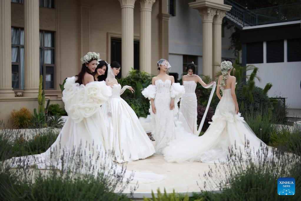BEIJING, 21 mayo, 2025 (Xinhua) -- Imagen del 20 de mayo de 2025 de mujeres con vestidos de novia vistas en un centro de arte nupcial, en Kunming, en la provincia de Yunnan, en el suroeste de China. La fecha del 20 de mayo tiene un significado especial en China, ya que su pronunciación china "520" se asemeja a la frase "wo ai ni", que significa "Te amo". Es una época de alta demanda de registros matrimoniales, con largas filas en los registros matrimoniales de todo el país. (Xinhua)