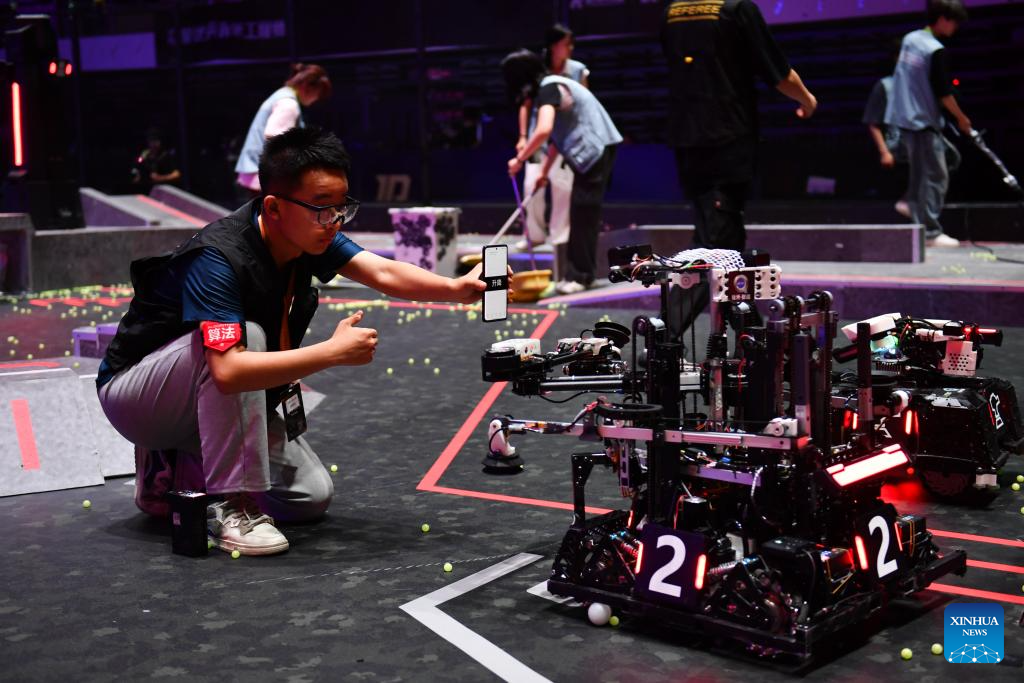 CHANGSHA, 21 mayo, 2025 (Xinhua) -- Concursantes de la Universidad de Tecnología de Hefei prueban sus robots durante la Competencia Regional del Campeonato Universitario RoboMaster 2025, en Changsha, en la provincia de Hunan, en el centro de China, el 21 de mayo de 2025. La competencia regional de cinco días comenzó aquí el miércoles y atrajo a equipos de 32 universidades de China. (Xinhua/Chen Zhenhai)