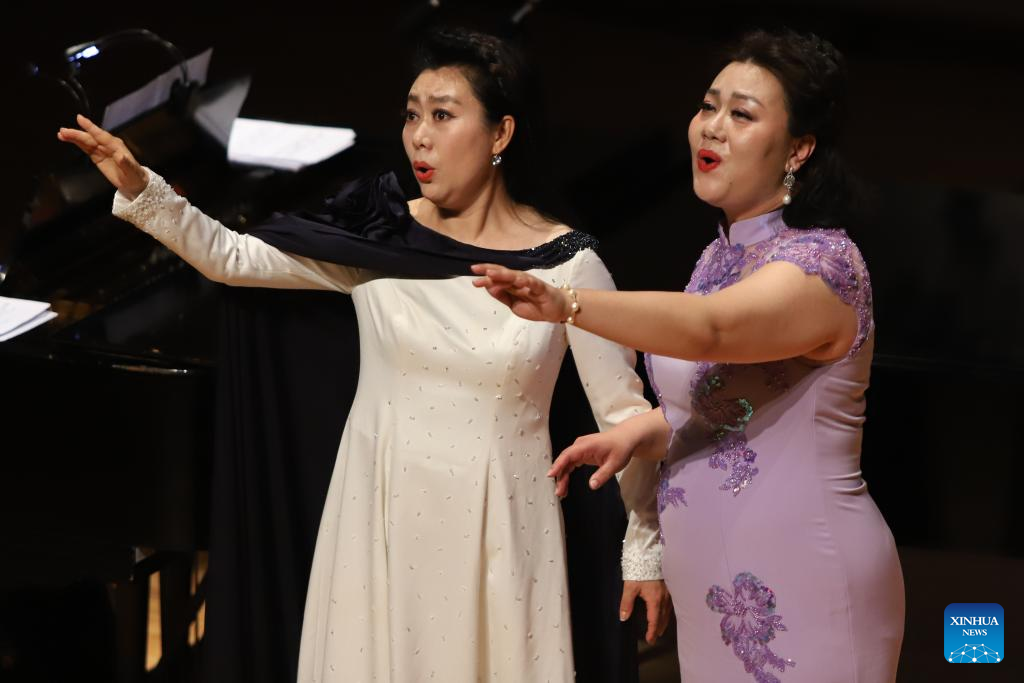 Imagen del 21 de mayo de 2025 de las sopranos, Zhang Lili (i), y Miao Yuanbi (d), interpretando un poema durante un concierto llevado a cabo en el Centro Nacional de las Artes, en la Ciudad de México, capital de México. Emotivas obras vocales inspiradas en la poesía clásica china shi y ci, interpretadas por virtuosos artistas de la China National Opera House, cautivaron al público mexicano durante un conmovedor concierto celebrado la noche del miércoles en la Ciudad de México. (Xinhua/Daniel Augusto)