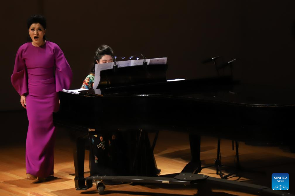 Imagen del 21 de mayo de 2025 de la vicepresidenta y soprano de primera categoría de la de la China National Opera House (CNOH, por sus siglas en inglés), Yao Hong (i), interpretando un poema durante un concierto llevado a cabo en el Centro Nacional de las Artes, en la Ciudad de México, capital de México. Emotivas obras vocales inspiradas en la poesía clásica china shi y ci, interpretadas por virtuosos artistas de la CNOH, cautivaron al público mexicano durante un conmovedor concierto celebrado la noche del miércoles en la Ciudad de México. (Xinhua/Daniel Augusto)