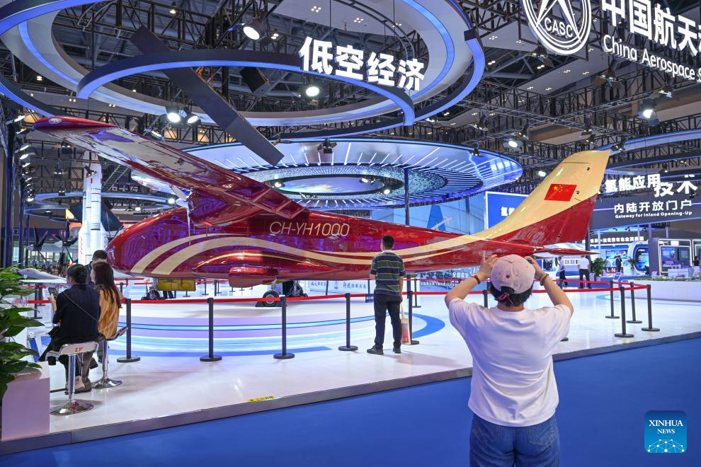 CHONGQING, 23 mayo, 2025 (Xinhua) -- Imagen del 22 de mayo de 2025 de personas observando un vehículo aéreo no tripulado en la VII Feria Internacional de Inversión y Comercio del Oeste de China, en el municipio de Chongqing, en el suroeste de China. Varios productos relacionados con la economía de baja altitud atrajeron la atención de los visitantes en la feria. (Xinhua/Chen Cheng)