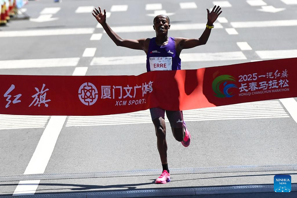 CHANGCHUN, 25 mayo, 2025 (Xinhua) -- Seboka Negusse Erre, de Etiopía, cruza la línea de meta para ganar la prueba masculina de maratón durante el Maratón de Hongqi Changchun 2025, en Changchun, en la provincia de Jilin, en el noreste de China, el 25 de mayo de 2025. (Xinhua/Zhang Nan)