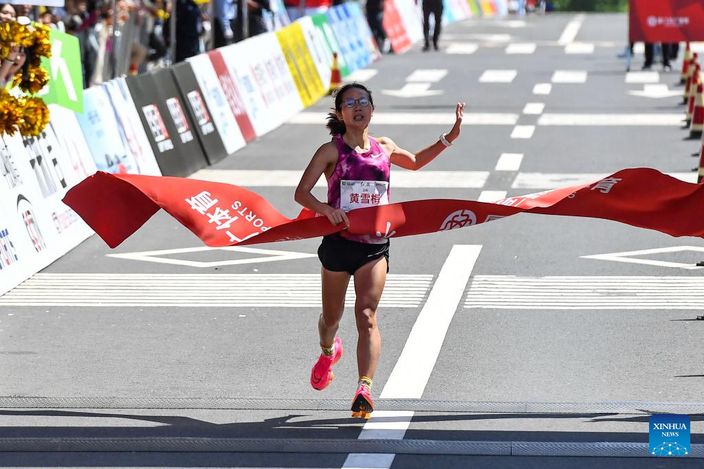 CHANGCHUN, 25 mayo, 2025 (Xinhua) -- Huang Xuemei, de China, cruza la línea de meta para ganar la prueba femenina de maratón durante el Maratón de Hongqi Changchun 2025, en Changchun, en la provincia de Jilin, en el noreste de China, el 25 de mayo de 2025. (Xinhua/Zhang Nan)