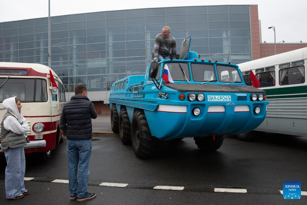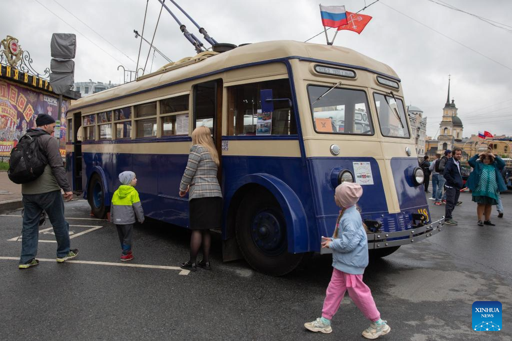 SAN PETERSBURGO, 25 mayo, 2025 (Xinhua) -- Imagen del 24 de mayo de 2025 de un autobús antiguo exhibido, en San Petersburgo, Rusia. Una exposición de vehículos antiguos se llevó a cabo el sábado como parte de las celebraciones del próximo 322° aniversario de la fundación de Rusia el 27 de mayo. (Xinhua/Irina Motina)