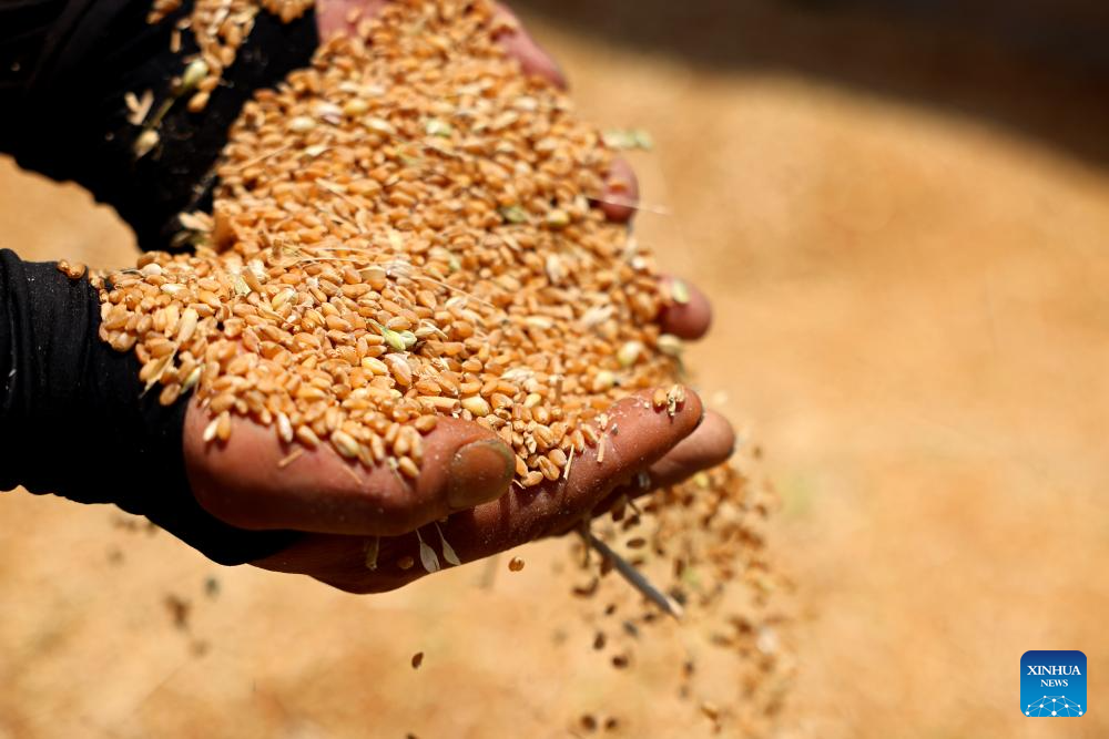 BEIJING, 25 mayo, 2025 (Xinhua) -- Un agricultor muestra trigo recién cosechado, en la aldea de Shagou de la ciudad de Zaozhuang, en la provincia de Shandong, en el este de China, el 25 de mayo de 2025. El trigo de invierno se cosecha sucesivamente en todo el país, según el Ministerio de Agricultura y Asuntos Rurales. (Xinhua/Sun Zhongzhe)