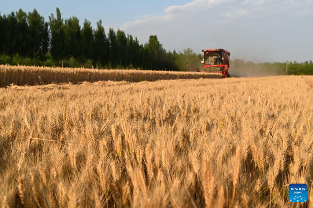 BEIJING, 25 mayo, 2025 (Xinhua) -- Una segadora cosecha trigo en los campos, en la aldea de Huzi de Qinyang, en la provincia de Henan, en el centro de China, el 25 de mayo de 2025. El trigo de invierno se cosecha sucesivamente en todo el país, según el Ministerio de Agricultura y Asuntos Rurales. (Xinhua/Yang Fan)