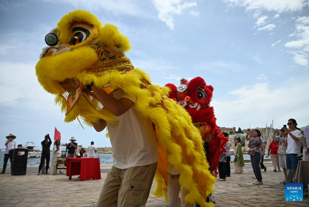 BIRGU, 25 mayo, 2025 (Xinhua) -- Imagen del 24 de mayo de 2025 de una presentación de la danza del león durante la primera carrera amistosa de botes del dragón de la Copa Duanwu, en Birgu, Malta. La carrera de botes dragón se celebró el sábado en la histórica ciudad de Birgu, en el este de Malta, para conmemorar el tradicional Festival de Botes Dragón chino. También conocido como Festival Duanwu, el Festival del Bote del Dragón se celebra el quinto día del quinto mes del calendario lunar chino. Este año cae el 31 de mayo. El acto fue organizado conjuntamente por el Centro Cultural Chino de Malta, el Club de Regatas de Birgu, la Cámara de Comercio Chino-Maltesa y la Asociación de la Comunidad China de Malta. (Xinhua/Jonathan Borg)