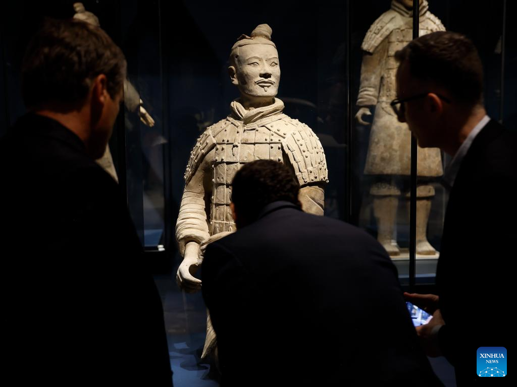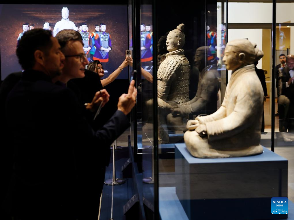 ORANGE COUNTY, 26 mayo, 2025 (Xinhua) -- Imagen del 22 de mayo de 2025 de personas visitando la exposición "El Mundo de los Guerreros de Terracota: Nuevos descubrimientos arqueológicos en Shaanxi en el siglo XXI", en el Museo Bowers, en Orange County, California, Estados Unidos. Los imponentes Guerreros de Terracota y los carruajes ornamentados muestran la grandeza de la antigua civilización china, mientras que los misteriosos artefactos de las ruinas de Shimao, en el noroeste de China, ofrecen una rara visión de una "superciudad" de hace unos 4.000 años. Estos son solo algunos de los aspectos más destacados de la exposición "El Mundo de los Guerreros de Terracota: Nuevos descubrimientos arqueológicos en Shaanxi en el siglo XXI", que se inauguró la semana pasada en el Museo Bowers de Orange County, California. (Xinhua/Qiu Chen)