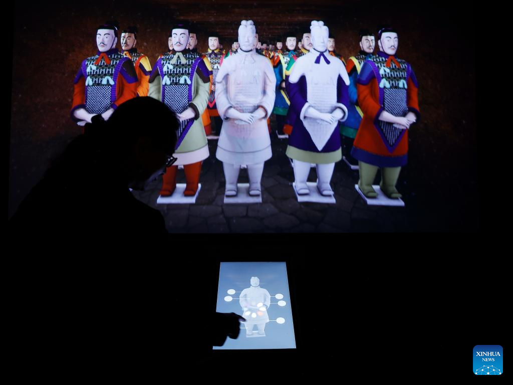 ORANGE COUNTY, 26 mayo, 2025 (Xinhua) -- Imagen del 22 de mayo de 2025 de un visitante "pintando" coloridos uniformes para los Guerreros de Terracota con una tableta, en el Museo Bowers, en Orange County, California, Estados Unidos. Los imponentes Guerreros de Terracota y los carruajes ornamentados muestran la grandeza de la antigua civilización china, mientras que los misteriosos artefactos de las ruinas de Shimao, en el noroeste de China, ofrecen una rara visión de una "superciudad" de hace unos 4.000 años. Estos son solo algunos de los aspectos más destacados de la exposición "El Mundo de los Guerreros de Terracota: Nuevos descubrimientos arqueológicos en Shaanxi en el siglo XXI", que se inauguró la semana pasada en el Museo Bowers de Orange County, California. (Xinhua/Qiu Chen)