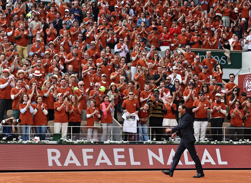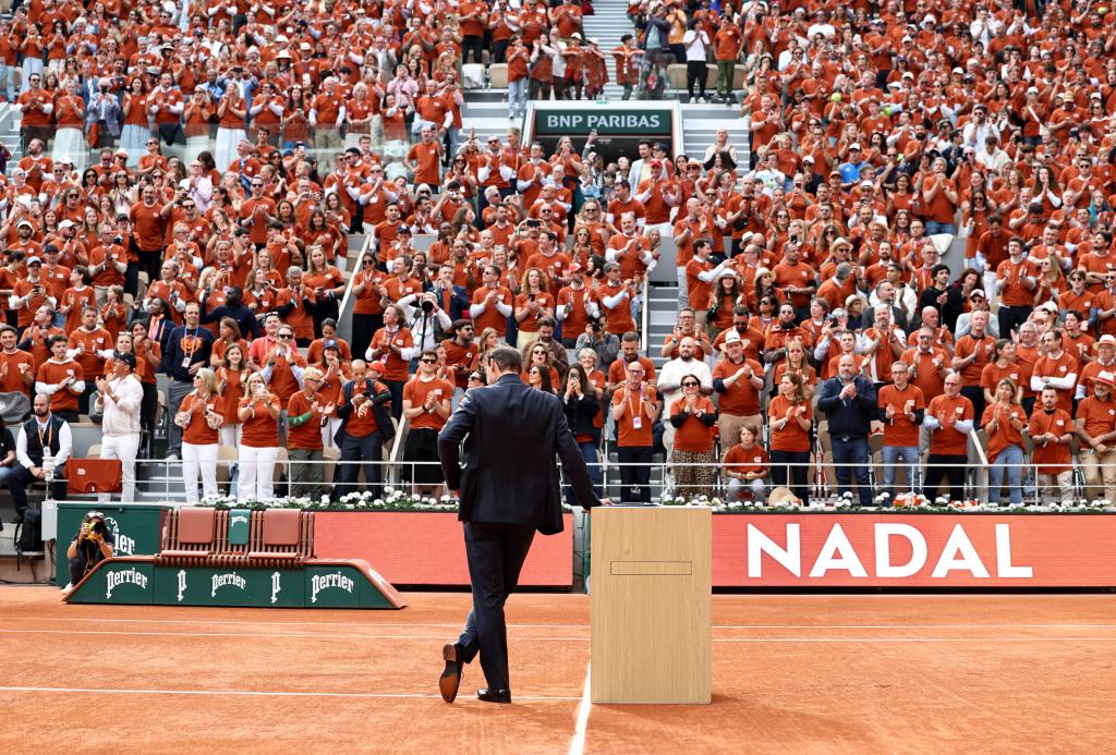 PARIS, 26 mayo, 2025 (Xinhua) -- Imagen del 25 de mayo de 2025 del ex tenista español, Rafael Nadal, reaccionando durante una ceremonia para honrar su carrera, durante el torneo de tenis Abierto de Francia, en la Cancha Philippe Chatrier, en Roland Garros, en París, Francia. (Xinhua/Li Jing)