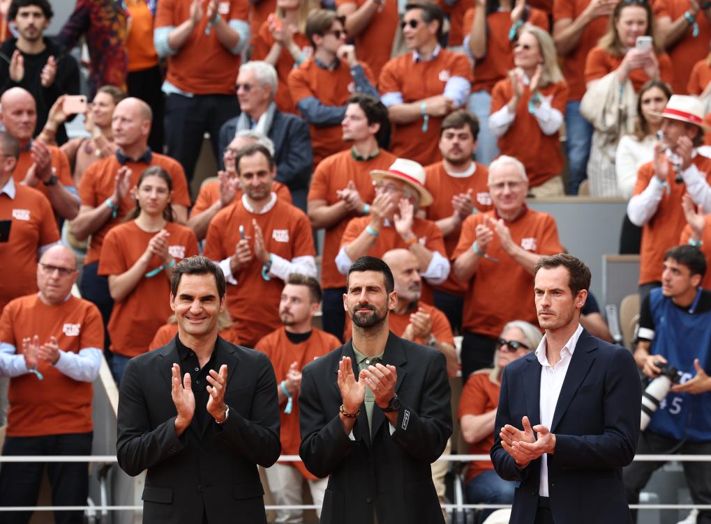 PARIS, 26 mayo, 2025 (Xinhua) -- (De izq. a der.) Imagen del 25 de mayo de 2025 de Roger Federer, Novak Djokovic y Andy Murray, asistiendo a una ceremonia llevada a cabo para honrar la carrera del ex tenista español, Rafael Nadal, durante el torneo de tenis Abierto de Francia, en la Cancha Philippe Chatrier, en Roland Garros, en París, Francia. (Xinhua/Li Jing)