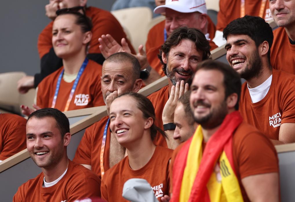 PARIS, 26 mayo, 2025 (Xinhua) -- Carlos Alcaraz (d-arriba), Iga Swiatek (c-frente) y Juan Carlos Ferrero (2-d-arriba), asistiendo a una ceremonia llevada a cabo para honrar la carrera del ex tenista español, Rafael Nadal, durante el torneo de tenis Abierto de Francia, en la Cancha Philippe Chatrier, en Roland Garros, en París, Francia. (Xinhua/Li Jing)
