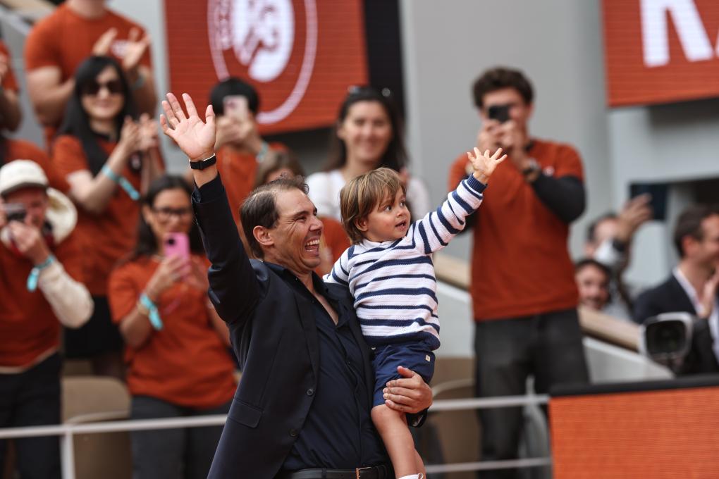 PARIS, 26 mayo, 2025 (Xinhua) -- Imagen del 25 de mayo de 2025 del ex tenista español, Rafael Nadal, con su hijo saludando al público durante una ceremonia para honrar su carrera, durante el torneo de tenis Abierto de Francia, en la Cancha Philippe Chatrier, en Roland Garros, en París, Francia. (Xinhua/Li Jing)
