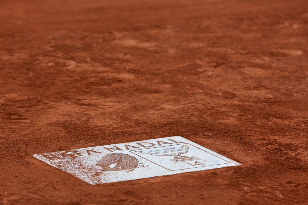 PARIS, 26 mayo, 2025 (Xinhua) -- Imagen del 25 de mayo de 2025 de una placa con la huella del ex tenista español, Rafael Nadal en honor a su carrera, durante el torneo de tenis Abierto de Francia, en la Cancha Philippe Chatrier, en Roland Garros, en París, Francia. (Xinhua/Li Jing)