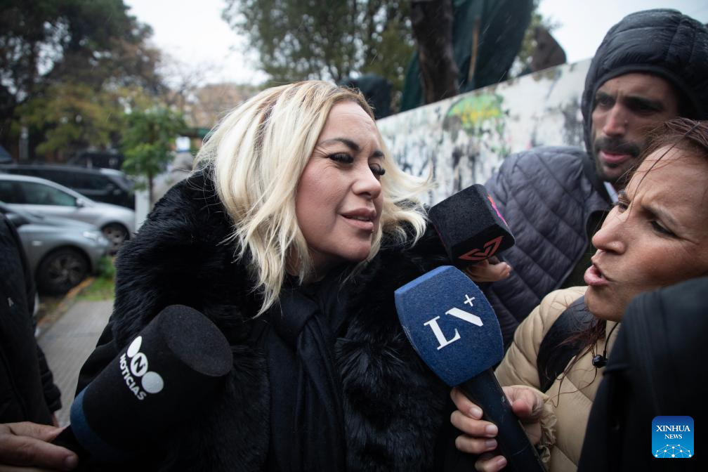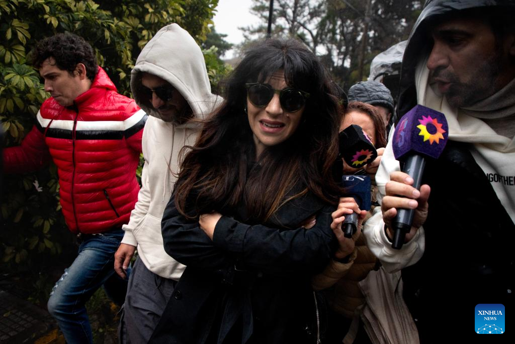 La hija del exfutbolista argentino, Diego Armando Maradona, Gianinna Maradona (c), reacciona previo a una nueva jornada del juicio por la muerte del exfutbolista, en los tribunales de San Isidro, en la ciudad de Buenos Aires, capital de Argentina, el 27 de mayo de 2025. Una jueza que integraba el tribunal del juicio por la muerte del exfutbolista argentino, Diego Armando Maradona, fue apartada el martes de su cargo. (Xinhua/Martín Zabala)