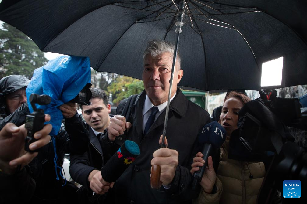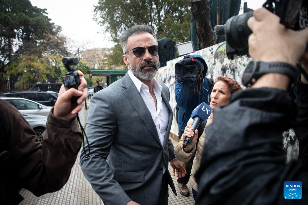 El abogado de las hijas del exfutbolista argentino, Diego Armando Maradona, Fernando Burlando (c), reacciona previo a una nueva jornada del juicio por la muerte del exfutbolista, en los tribunales de San Isidro, en la ciudad de Buenos Aires, capital de Argentina, el 27 de mayo de 2025. Una jueza que integraba el tribunal del juicio por la muerte del exfutbolista argentino, Diego Armando Maradona, fue apartada el martes de su cargo. (Xinhua/Martín Zabala)