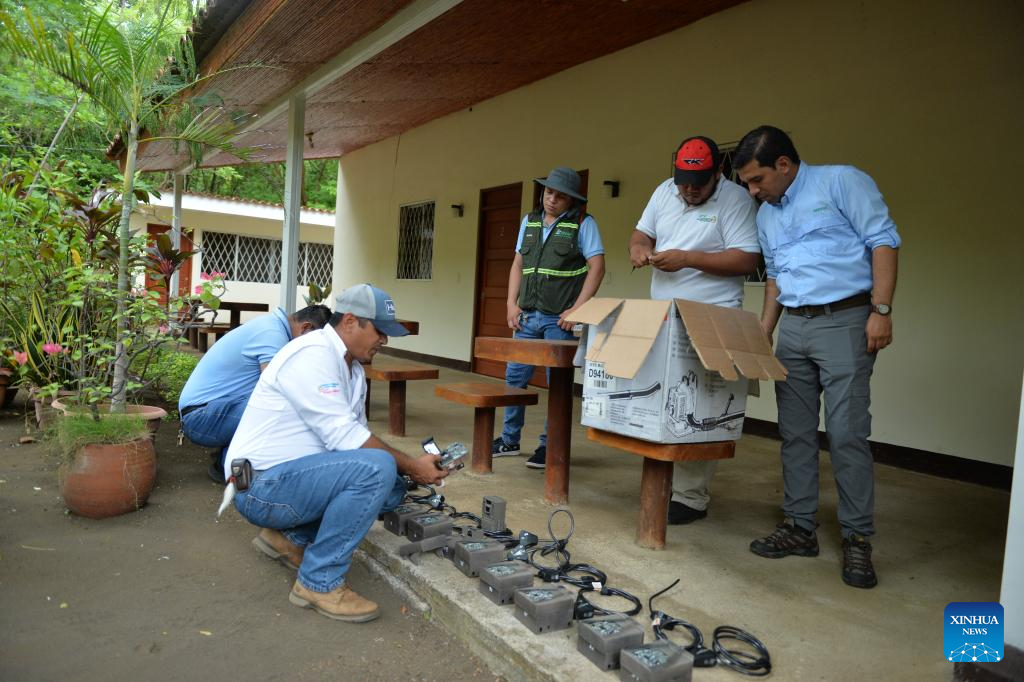 MANAGUA, 28 mayo, 2025 (Xinhua) -- Imagen del 27 de mayo de 2025 de personas revisando la instalación de "cámaras trampa", en el Parque Nacional Volcán Masaya, a 23 km de Managua, capital de Nicaragua. Nicaragua está tomando medidas pioneras para proteger su vida silvestre con la instalación de "cámaras trampa" en sus ecosistemas. La estrategia, implementada desde 2023 por el Ministerio del Ambiente y de los Recursos Naturales, ha logrado avances importantes en el monitoreo de especies en peligro de extinción en las 76 áreas de conservación ambiental del país centroamericano. (Xinhua/Noelia Aráuz)