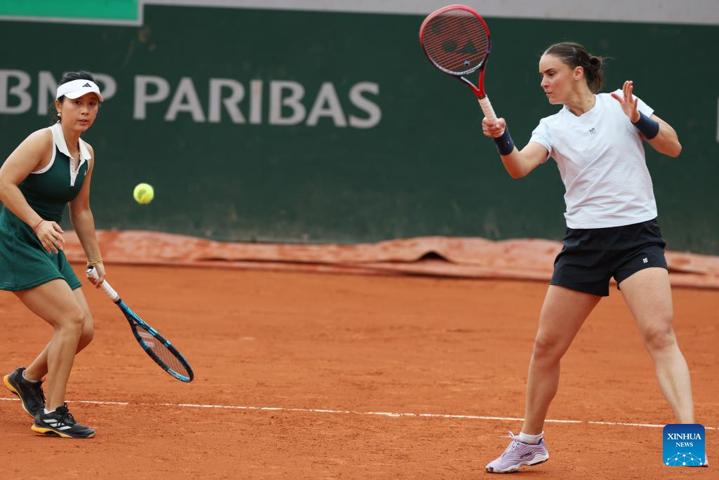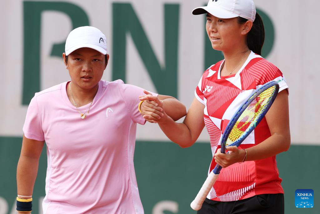 PARIS, 28 mayo, 2025 (Xinhua) -- Jiang Xinyu (i)/Wu Fang-Hsien compien durante el partido de primera ronda de dobles femeninos entre Jiang Xinyu (China)/Wu Fang-Hsien (Taipei de China) y Camila Osorio (Colombia)/Alycia Parks (Estados Unidos), en el torneo de tenis Abierto de Francia, en Roland Garros, en París, Francia, el 28 de mayo de 2025. (Xinhua/Gao Jing)