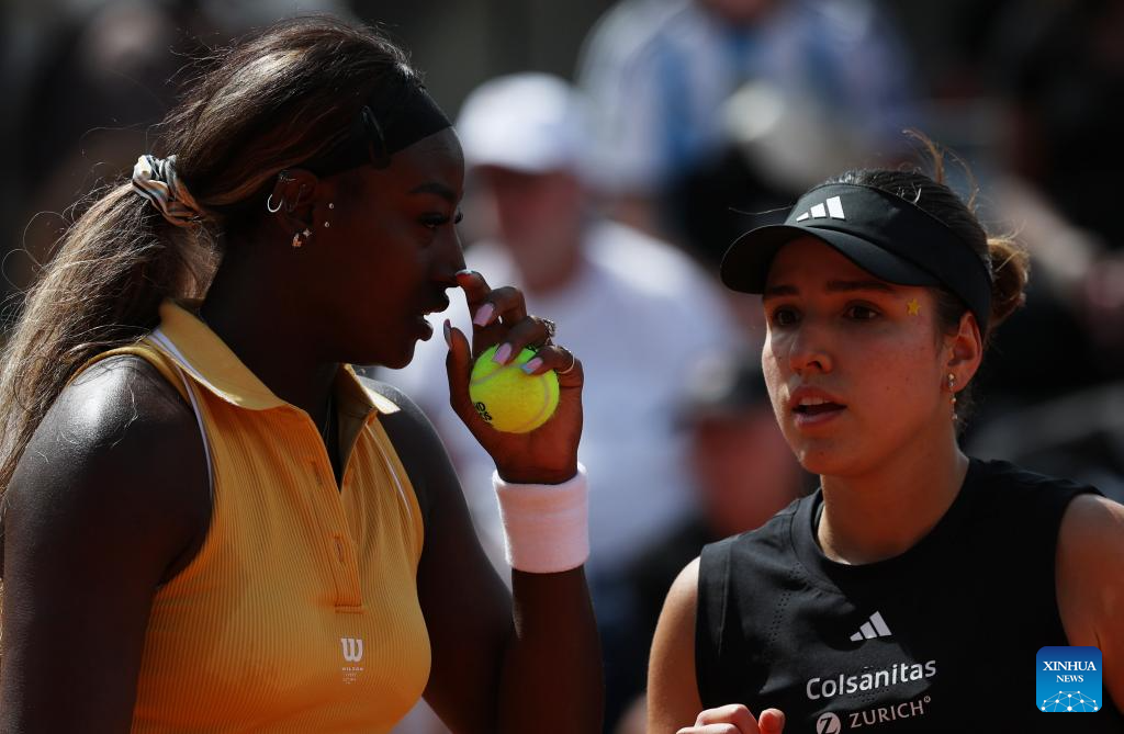 PARIS, 28 mayo, 2025 (Xinhua) -- Camila Osorio (d)/Alycia Parks conversan durante el partido de primera ronda de dobles femeninos entre Jiang Xinyu (China)/Wu Fang-Hsien (Taipei de China) y Camila Osorio (Colombia)/Alycia Parks (Estados Unidos), en el torneo de tenis Abierto de Francia, en Roland Garros, en París, Francia, el 28 de mayo de 2025. (Xinhua/Gao Jing)