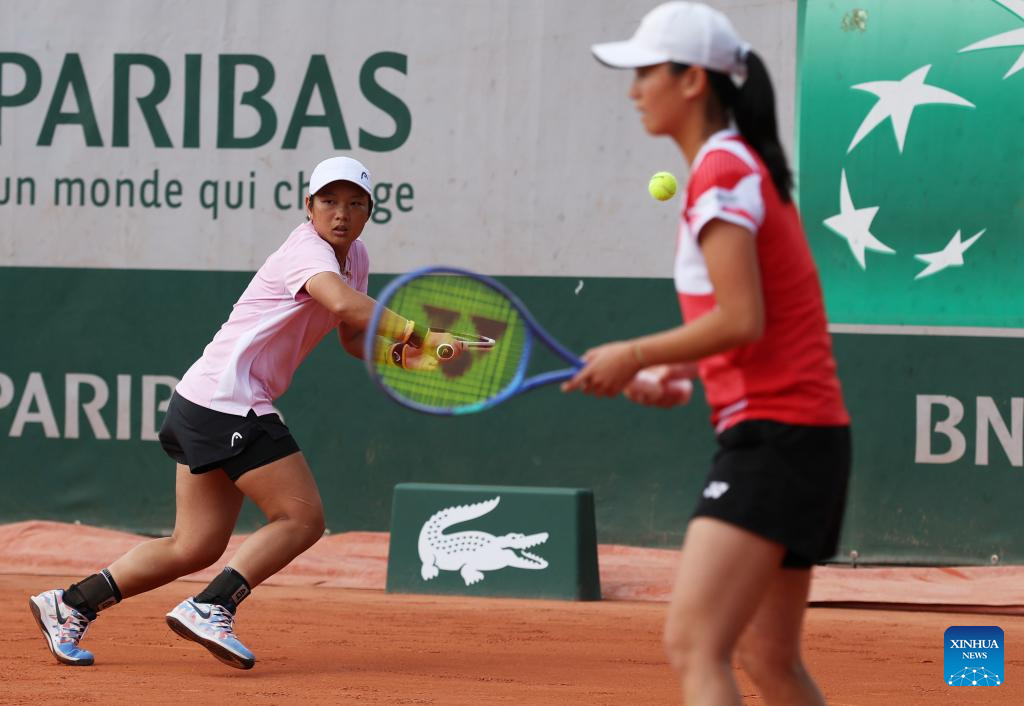 PARIS, 28 mayo, 2025 (Xinhua) -- Jiang Xinyu (i)/Wu Fang-Hsien festejan después de ganar el partido de primera ronda de dobles femeninos entre Jiang Xinyu (China)/Wu Fang-Hsien (Taipei de China) y Camila Osorio (Colombia)/Alycia Parks (Estados Unidos), en el torneo de tenis Abierto de Francia, en Roland Garros, en París, Francia, el 28 de mayo de 2025. (Xinhua/Gao Jing)