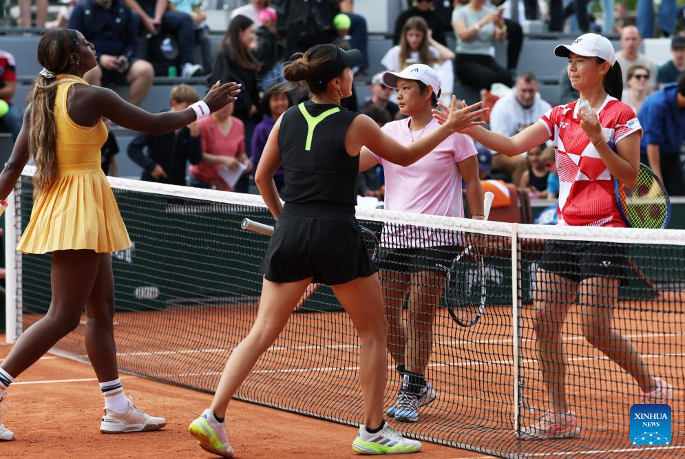 PARIS, 28 mayo, 2025 (Xinhua) -- Camila Osorio (2-i)/Alycia Parks (i) saludan a Jiang Xinyu (2-d)/Wu Fang-Hsien al término del partido de primera ronda de dobles femeninos entre Jiang Xinyu (China)/Wu Fang-Hsien (Taipei de China) y Camila Osorio (Colombia)/Alycia Parks (Estados Unidos), en el torneo de tenis Abierto de Francia, en Roland Garros, en París, Francia, el 28 de mayo de 2025. (Xinhua/Gao Jing)