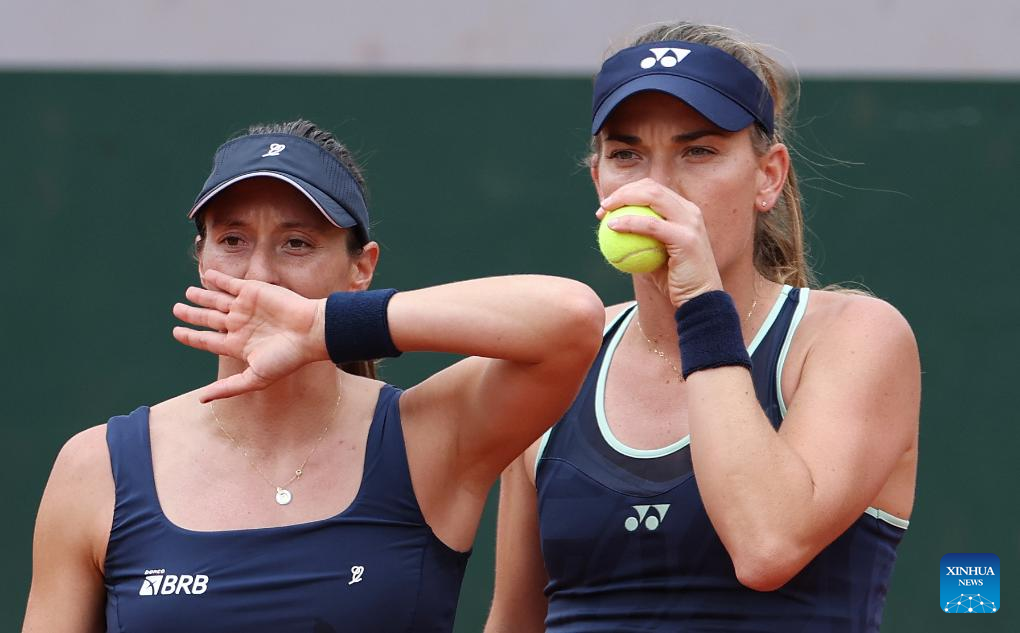 PARIS, 28 mayo, 2025 (Xinhua) -- Timea Babos (i)/Luisa Stefani reaccionan durante el partido de primera ronda de dobles femeninos entre Anhelina Kalinina (Ucrania)/Xu Yifan (China) y Timea Babos (Hungría)/Luisa Stefani (Brasil), en el torneo de tenis Abierto de Francia, en Roland Garros, en París, Francia, el 28 de mayo de 2025. (Xinhua/Gao Jing)