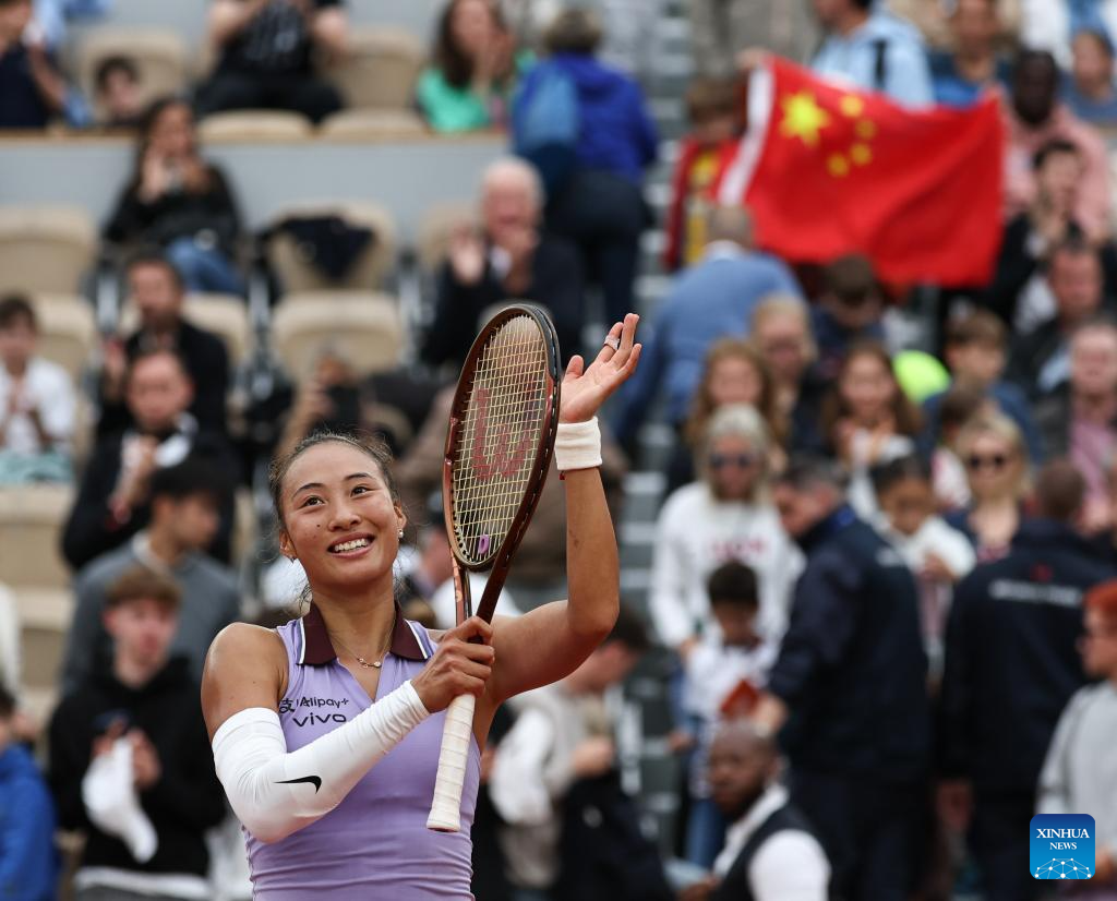 PARIS, 28 mayo, 2025 (Xinhua) -- Zheng Qinwen festeja al término del partido de segunda ronda de individuales femeninos entre Zheng Qinwen, de China, y Emiliana Arango, de Colombia, en el torneo de tenis Abierto de Francia, en Roland Garros, en París, Francia, el 28 de mayo de 2025. (Xinhua/Li Jing)