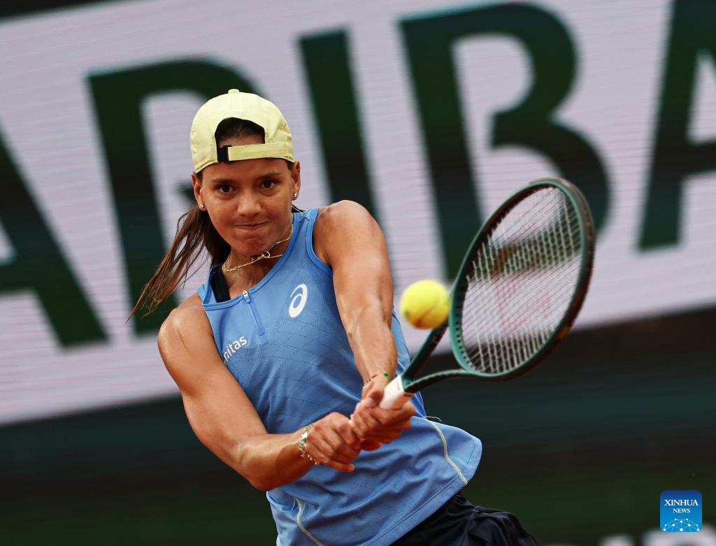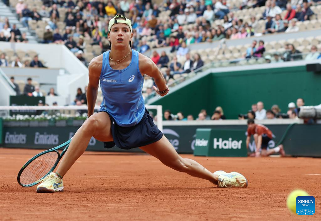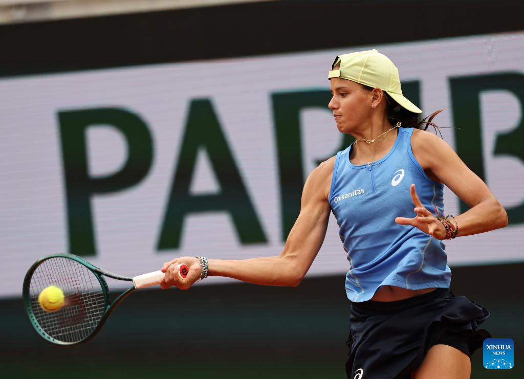 PARIS, 28 mayo, 2025 (Xinhua) -- Emiliana Arango devuelve la pelota durante el partido de segunda ronda de individuales femeninos entre Zheng Qinwen, de China, y Emiliana Arango, de Colombia, en el torneo de tenis Abierto de Francia, en Roland Garros, en París, Francia, el 28 de mayo de 2025. (Xinhua/Li Jing)
