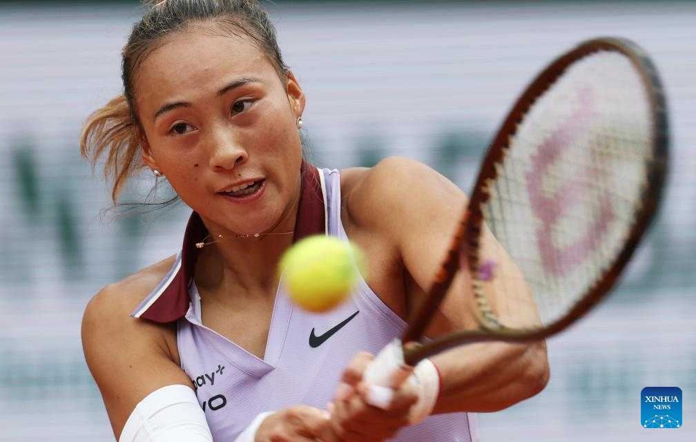 PARIS, 28 mayo, 2025 (Xinhua) -- Zheng Qinwen devuelve la pelota durante el partido de segunda ronda de individuales femeninos entre Zheng Qinwen, de China, y Emiliana Arango, de Colombia, en el torneo de tenis Abierto de Francia, en Roland Garros, en París, Francia, el 28 de mayo de 2025. (Xinhua/Gao Jing)