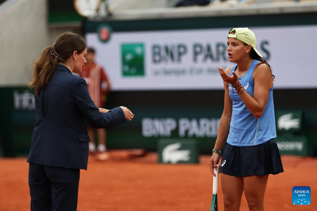 PARIS, 28 mayo, 2025 (Xinhua) -- Emiliana Arango (d), discute con la juez de silla durante el partido de segunda ronda de individuales femeninos entre Zheng Qinwen, de China, y Emiliana Arango, de Colombia, en el torneo de tenis Abierto de Francia, en Roland Garros, en París, Francia, el 28 de mayo de 2025. (Xinhua/Li Jing)