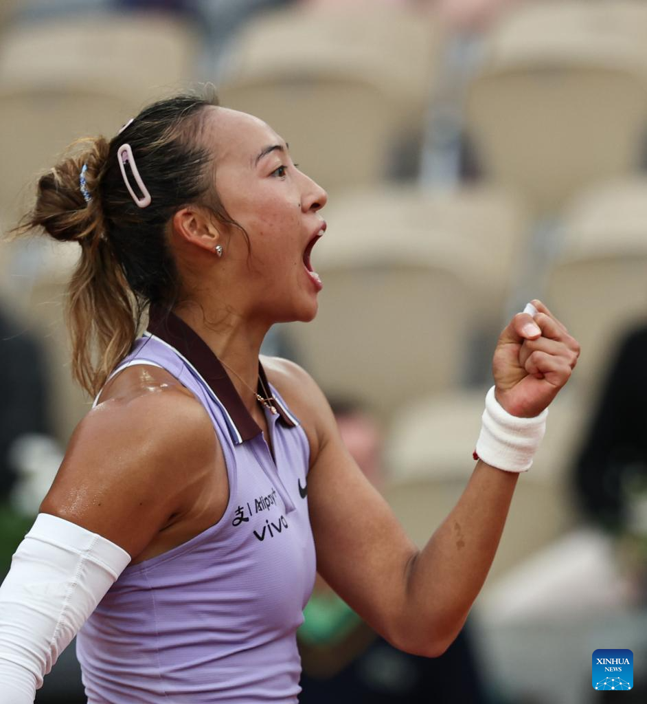 PARIS, 28 mayo, 2025 (Xinhua) -- Zheng Qinwen festeja durante el partido de segunda ronda de individuales femeninos entre Zheng Qinwen, de China, y Emiliana Arango, de Colombia, en el torneo de tenis Abierto de Francia, en Roland Garros, en París, Francia, el 28 de mayo de 2025. (Xinhua/Li Jing)