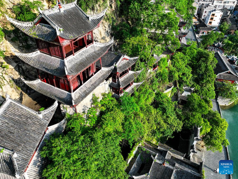 ZHENYUAN, 28 mayo, 2025 (Xinhua) -- Vista aérea tomada con un dron el 20 de mayo de 2025 del Complejo de Cuevas Qinglong construido en el acantilado, en el poblado antiguo de Zhenyuan, en la prefectura autónoma de las etnias miao y dong de Qiandongnan, en la provincia de Guizhou, en el suroeste de China. El complejo arquitectónico, situado sobre un acantilado de 300 metros de largo y 80 metros de alto, es un modelo de la integración de caracteres arquitectónicos entre el norte y el sur de China. (Xinhua/Ou Dongqu)