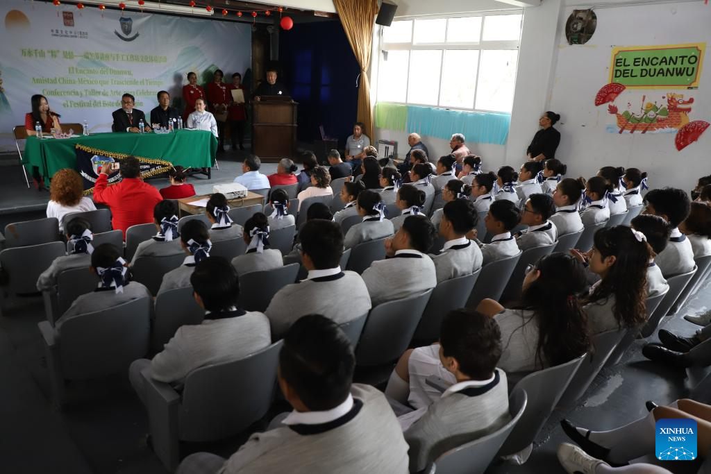NEZAHUALCOYOTL, 29 mayo, 2025 -- Imagen del 28 de mayo de 2025 de estudiantes participando en una actividad durante un evento para celebrar el Festival del Bote del Dragón, en la Escuela Secundaria "Leyes de Reforma", en Nezahualcóyotl, México. (Xinhua/Daniel Augusto)