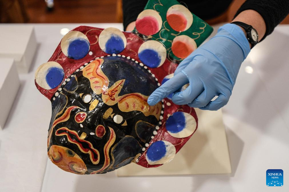 Entre los objetos restaurados en esta colección, resalta una imponente cometa de papel con forma de libélula y máscaras de papel de la Ópera China.
