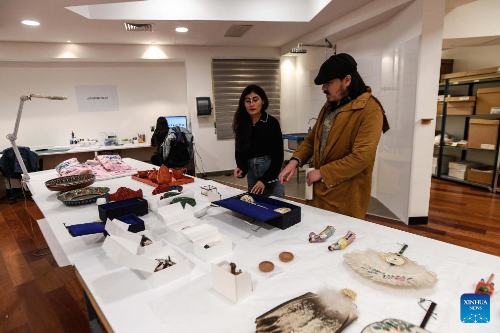 Imagen del 27 de mayo de 2025 de la encargada de Colecciones del Museo de Arte Popular Americano (MAPA) Tomás Lago de Chile, Paula Cabrera (i), realizando una exposición de la colección de objetos chinos exhibidos en el MAPA, en Santiago, capital de Chile. El MAPA se ubica en la actualidad en la plataforma cultural del Campus Juan Gómez Millas de la Universidad de Chile, en la capital, donde trabajan la conservación, restauración e investigación de las 8.000 piezas que poseen, de las cuales unas 500 son chinas. (Xinhua/Jorge Villegas)