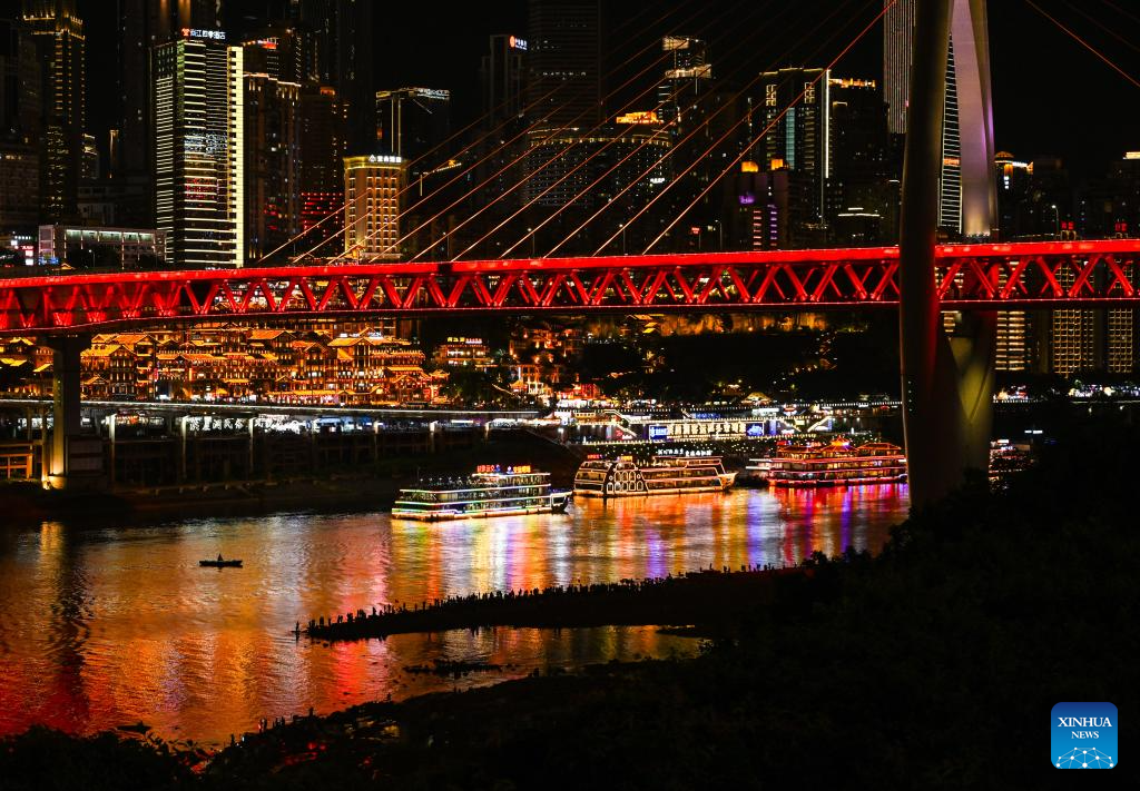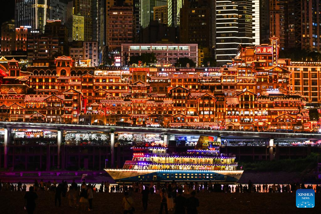 CHONGQING, 29 mayo, 2025 (Xinhua) -- Imagen del 28 de mayo de 2025 de la vista nocturna del área escénica de Hongyadong, en Chongqing, en el suroeste de China. Hongyadong en Chongqing es una antigua puerta de la ciudad que se ha transformado en un gigantesco edificio suspendido que alberga restaurantes y otros lugares de entretenimiento. (Xinhua/Wang Quanchao)